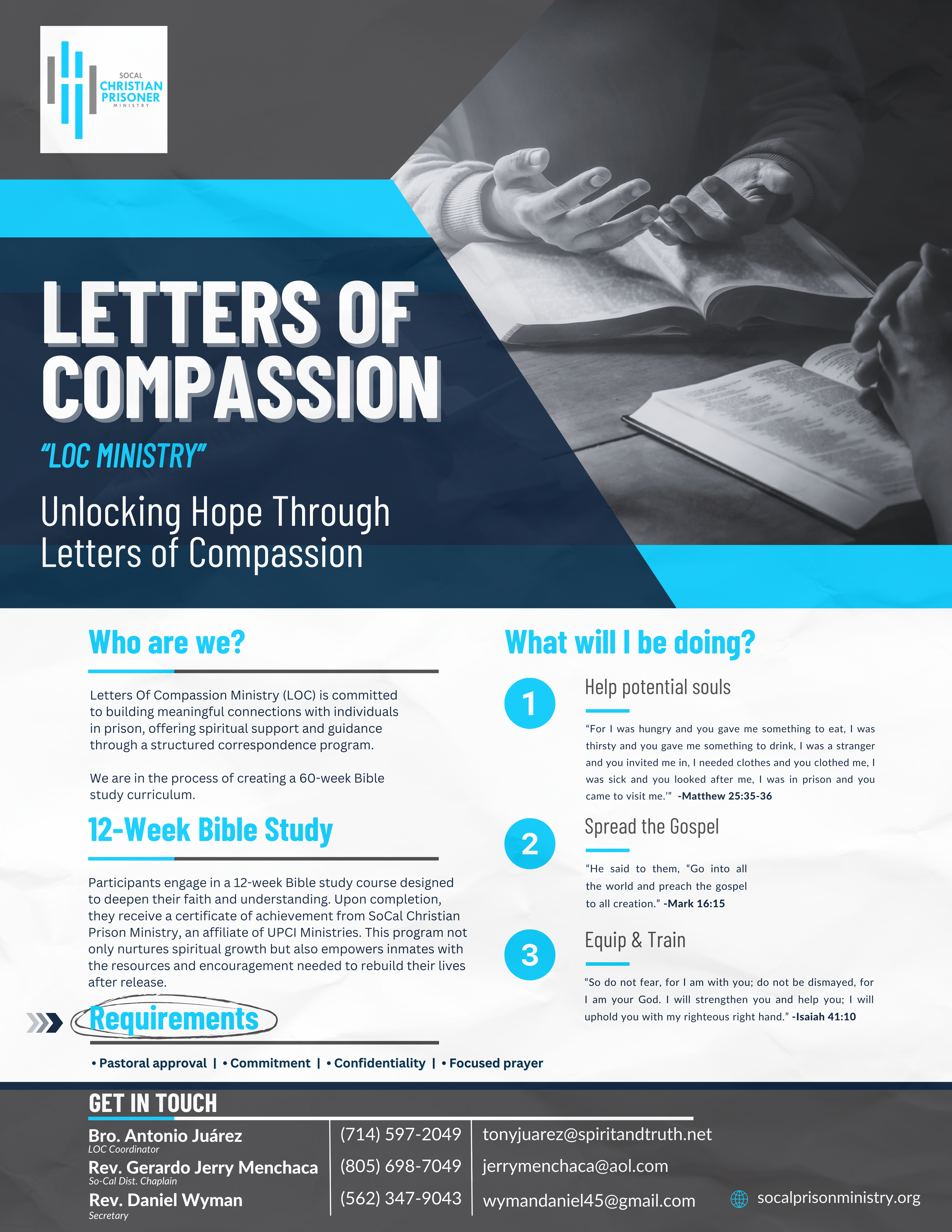Our wide-reaching presence allows us to extend a helping hand to those seeking redemption and spiritual guidance throughout this expansive region. Together we can make a difference and bring hope to those in the criminal justice system. Join SoCal District Prisoner Ministry in our mission to share God’s love and support across the Southwest.